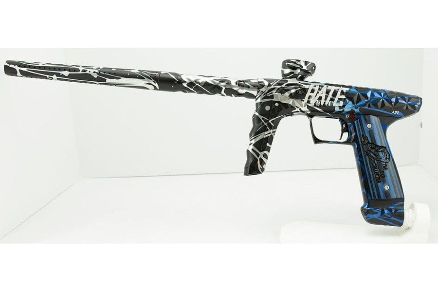 In full dust black body with high polish splash in blue (rear) to silver (front) fade (only the high polished splash is faded, body is dust black). Comes with or without HATE lasered on both sides like Jacob’s gun.